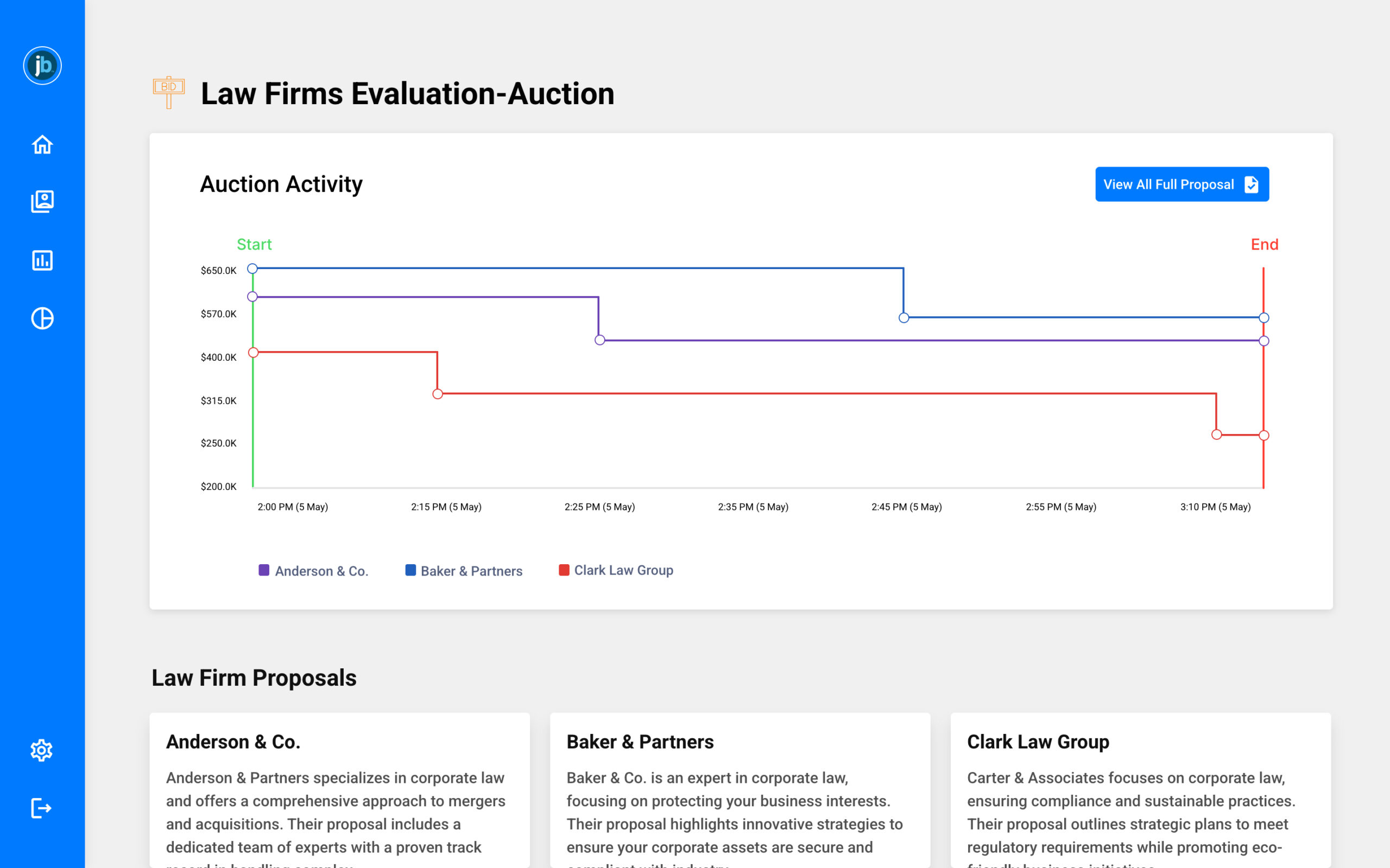 Run sophisticated auctions with real-time transparency to the selection process, ensuring the best law firm is selected at the best possible price. Assess strategies and teams. Review scoring to see which law firms rise to the top.